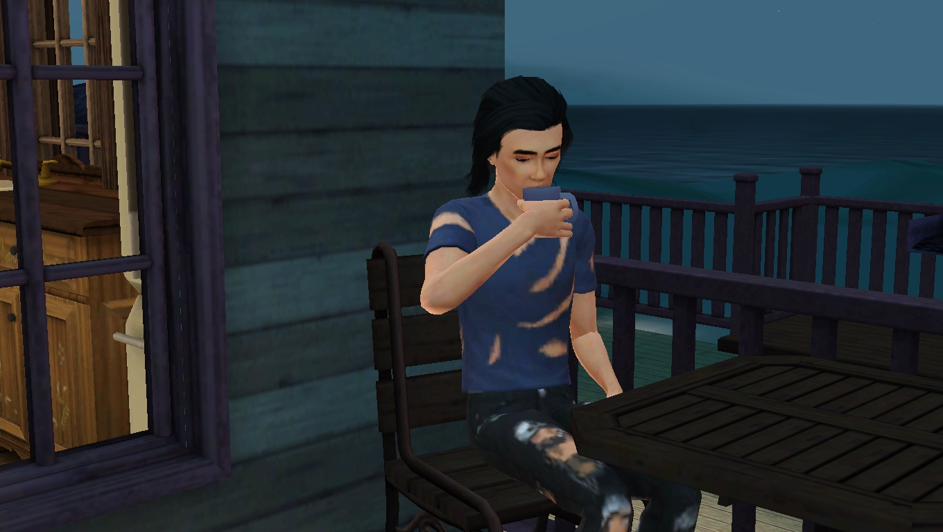 He takes it outside and slowly sips it, savoring the hot and bitter taste on his tongue.